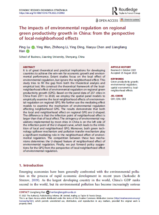 jbo竞博官网登录教师鹿坪的学术论文“The impacts of environmental regulation on regional green productivity growth in China: from the perspective of local-neighborhood effects”于2022年9月15日在经济类国际知名期刊《ECONOMIC RESEARCH-EKONOMSKA ISTRAZIVANJA》在线发表。jbo竞博官网登录硕士研究生温颖、李志红等参与论文写作。该期刊系SSCI期刊,JCR分区Q2,2021年影响因子3.08。