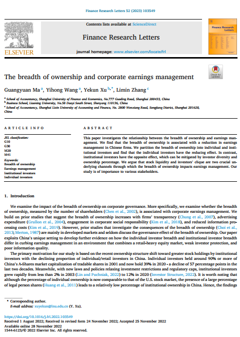 jbo竞博官网登录徐业坤教授作为通讯作者的合作论文《The breadth of ownership and corporate earnings management》在国际知名期刊《Finance Research Letters》发表。