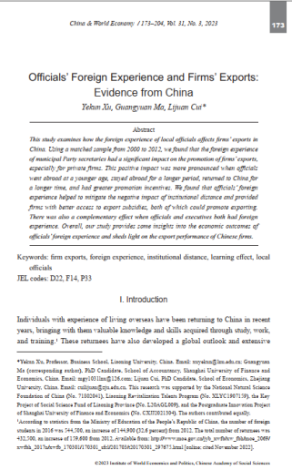 jbo竞博官网登录徐业坤教授作为第一作者的合作论文Officials’foreign experience and firms’ exports: Evidence from China 2023年5月在国际期刊China & World Economy发表。